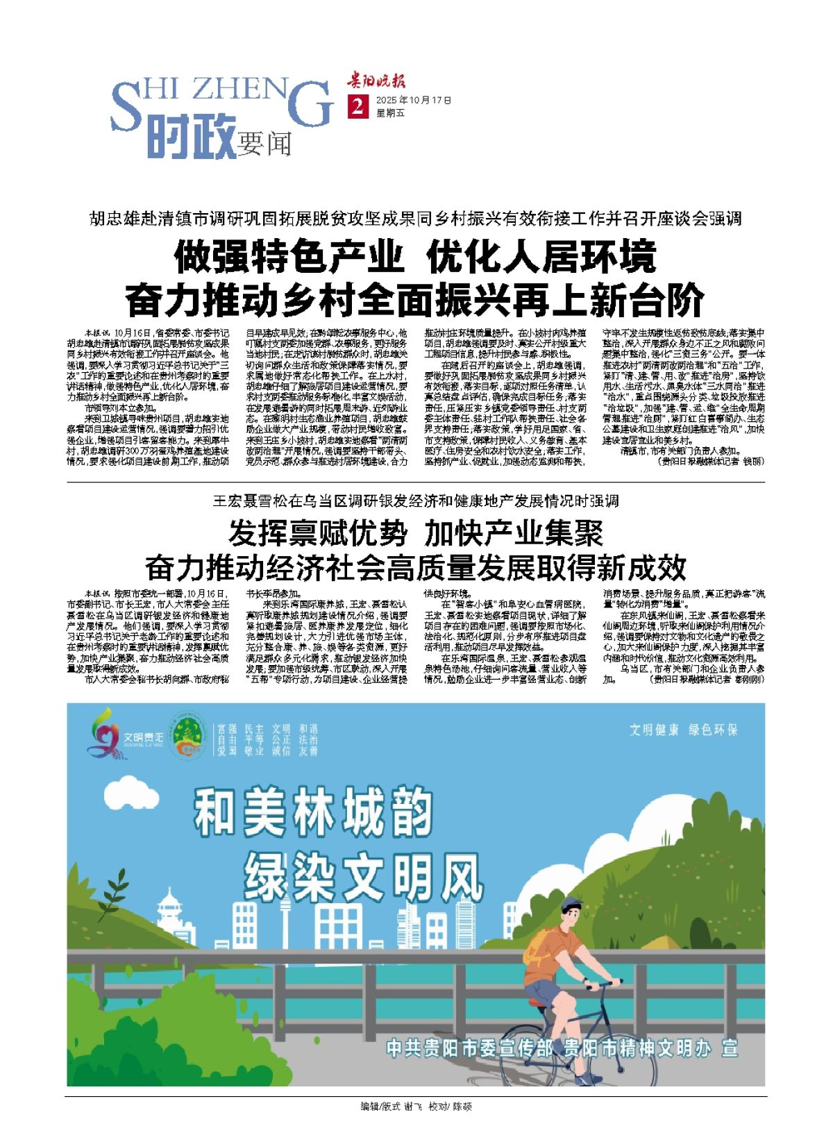 本报讯 10月16日,省委常委、市委书记胡忠雄赴清镇市调研巩固拓展脱贫攻坚成果同乡村振兴有效衔接工作并召开座谈会。他强调,要深入学习贯彻习近平总书记关于“三农”工作的重要论述和在贵州考察时的重
