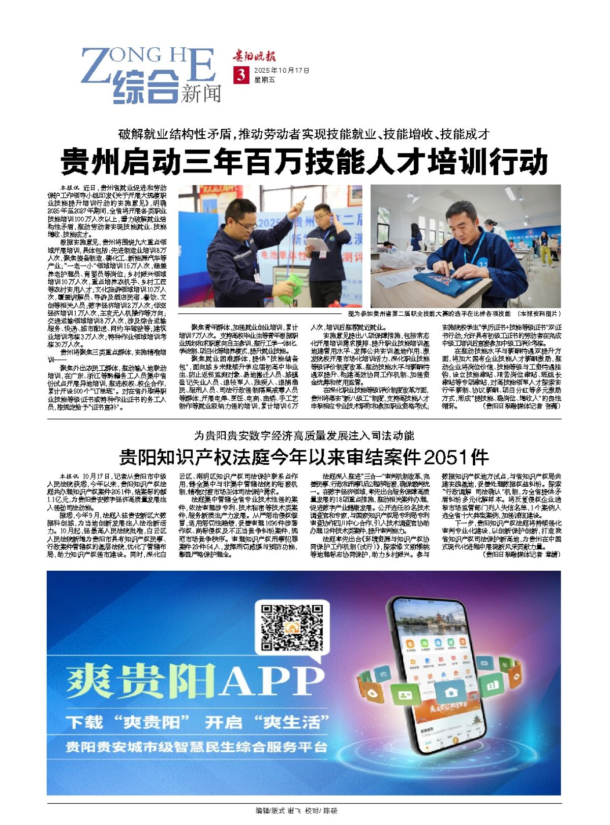 本报讯 10月17日,记者从贵阳市中级人民法院获悉,今年以来,贵阳知识产权法庭共办理知识产权案件2051件,结案标的额1.1亿元,为贵阳贵安数字经济高质量发展注入强劲司法动能。 据悉,今