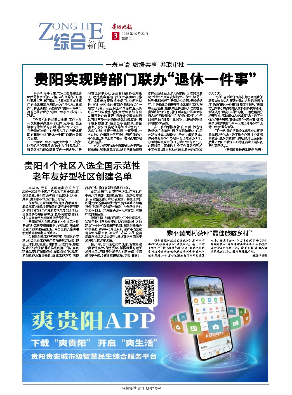 本报讯 近日,全国老龄办公布了2025—2026年全国示范性老年友好型社区创建名单,贵州省共有53个社区(村)入选,其中,贵阳市4个社区“榜上有名”。 据介绍,这些创建单位是经自愿申报、