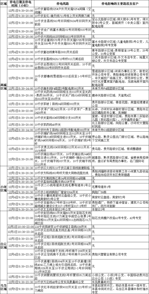 为了提高电网供电质量,贵阳市2025年12月1日-7日将对以下线路进行计划检修停电,请广大客户做好停电准备,对此给您造成的不便,我们表示深深的歉意。