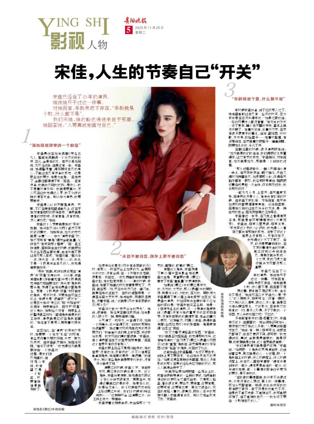 宋佳已经当了25年的演员。 她说她只干过这一件事。 对她而言,年龄焦虑不存在,“年龄就是个数,什么都不是”。 我们问她,她的豁达通透来自于哪里,她回答说:“人要真诚地面对自己