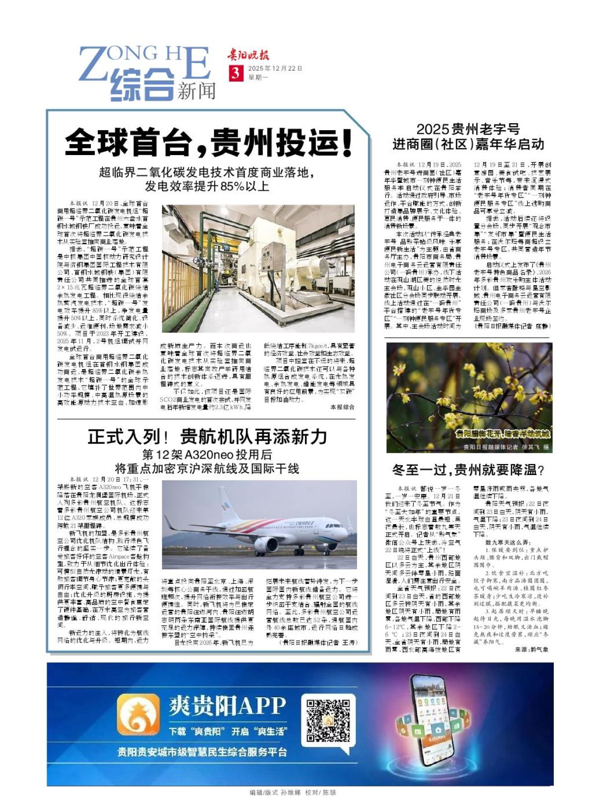 本报讯 12月20日,全球首台商用超临界二氧化碳发电机组“超碳一号”示范工程在贵州六盘水首钢水城钢铁厂成功投运,意味着全球首次将超临界二氧化碳发电技术从实验室推向商业落地。 据悉,“超碳