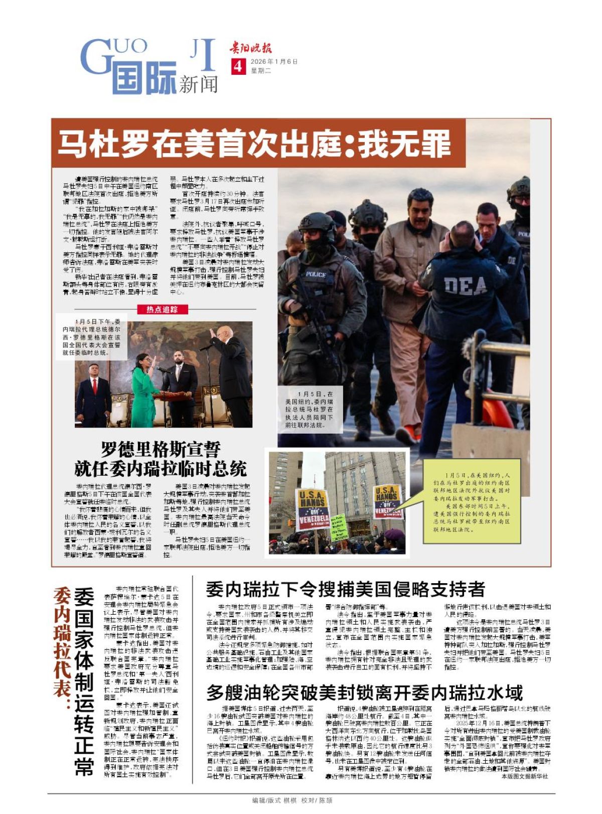 遭美国强行控制的委内瑞拉总统马杜罗夫妇5日中午在美国纽约南区联邦地区法院首次出庭,拒绝美方所谓“犯罪”指控。 “我在加拉加斯的家中被绑架”“我是无辜的,我无罪”“我仍然是委内瑞拉总统”,