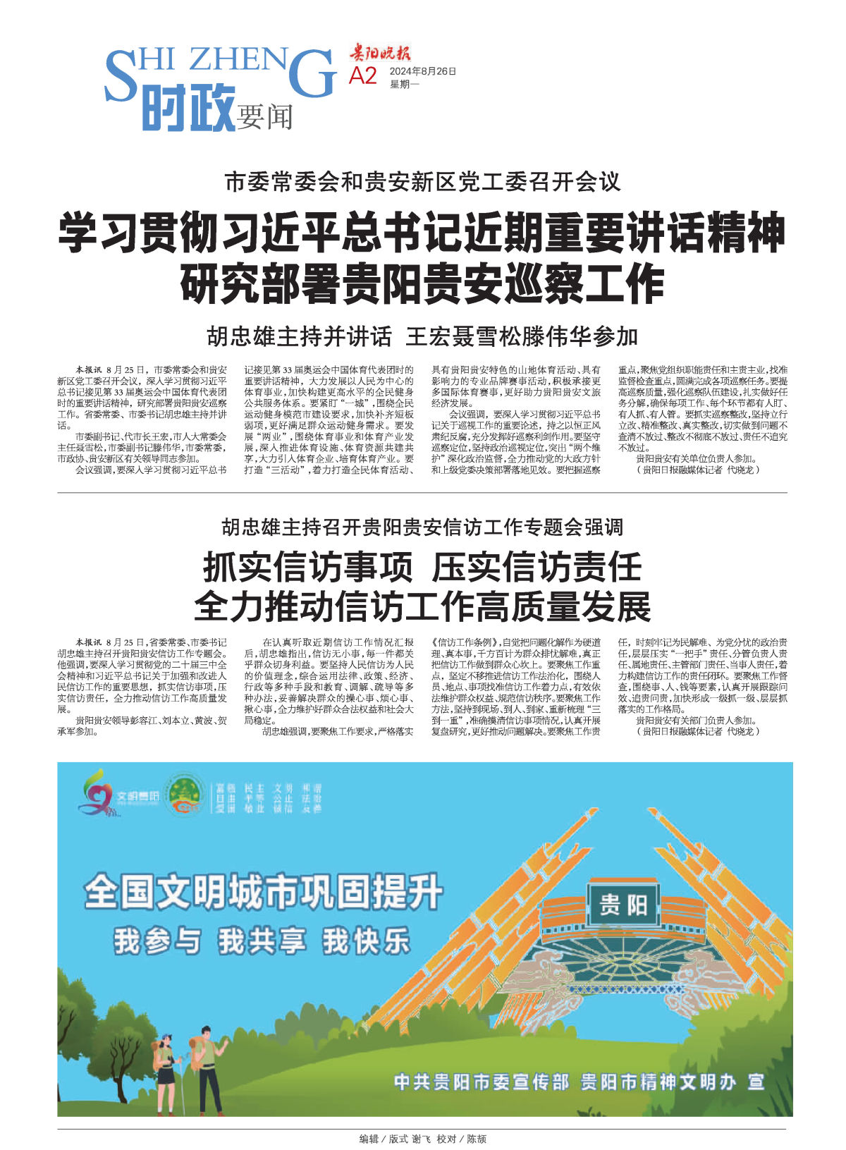 本报讯 8月25日,市委常委会和贵安新区党工委召开会议,深入学习贯彻习近平总书记接见第33届奥运会中国体育代表团时的重要讲话精神,研究部署贵阳贵安巡察工作。省委常委、市委书记胡忠雄主持并讲