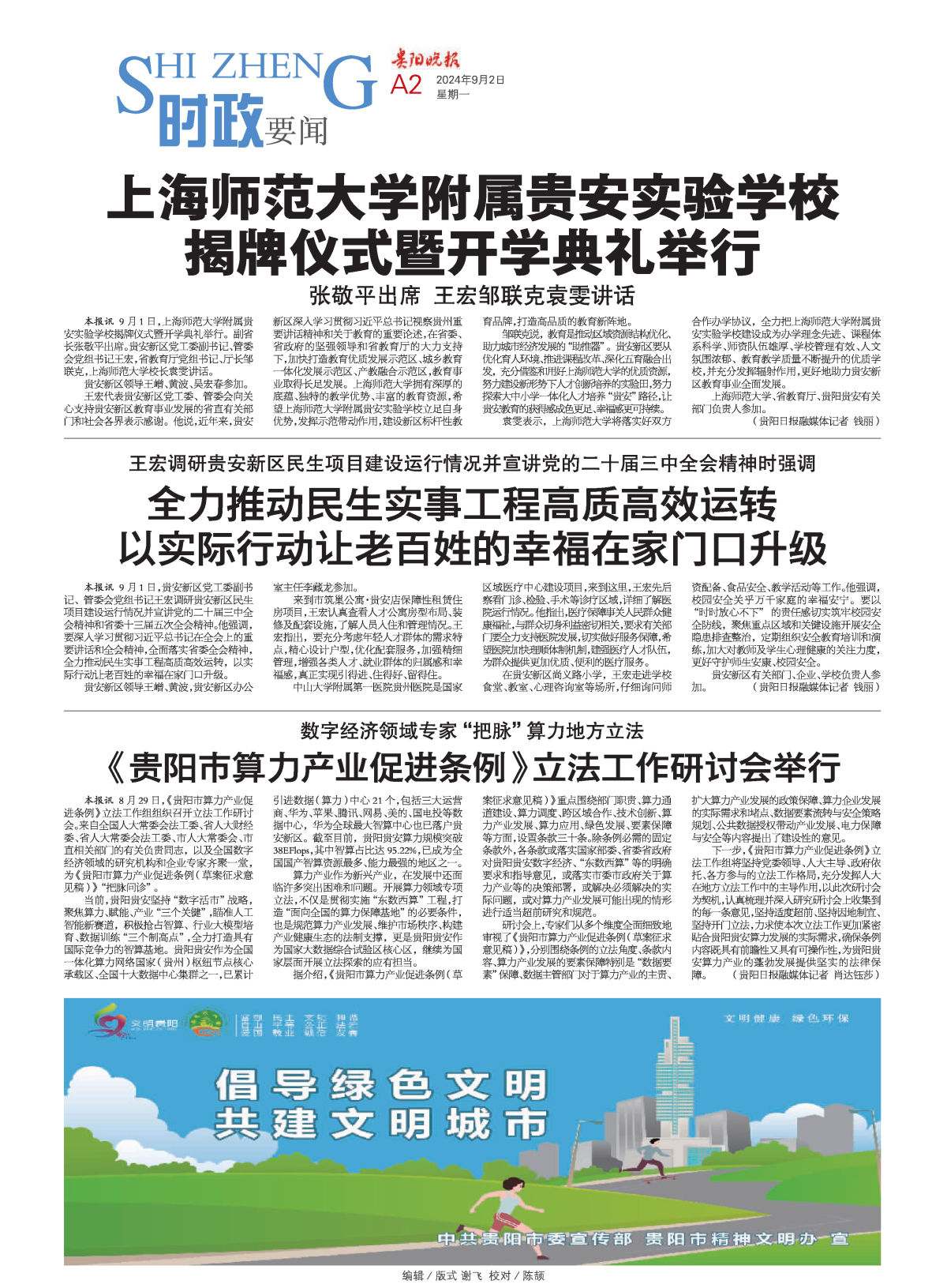 本报讯 9月1日,上海师范大学附属贵安实验学校揭牌仪式暨开学典礼举行。副省长张敬平出席。贵安新区党工委副书记、管委会党组书记王宏,省教育厅党组书记、厅长邹联克,上海师范大学校长袁雯讲话。 贵
