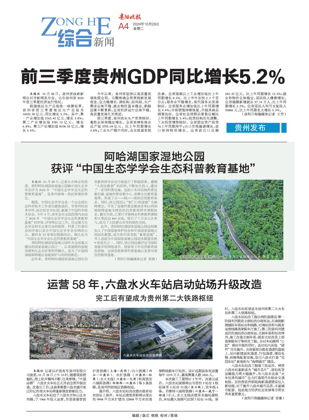 本报讯 10月28日,贵州省政府新闻办召开新闻发布会,公布贵州省2024年前三季度经济运行情况。 根据地区生产总值统一核算结果,贵州省前三季度地区生产总值为16052.90亿元,同比增长5.2%