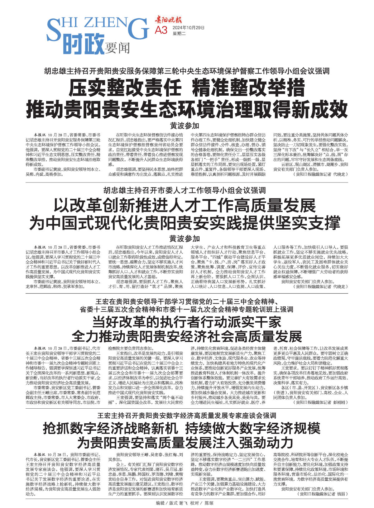 本报讯 10月28日,省委常委、市委书记胡忠雄主持召开贵阳贵安服务保障第三轮中央生态环境保护督察工作领导小组会议。他强调,要深入贯彻党的二十届三中全会精神和习近平生态文明思想,压实整改责任