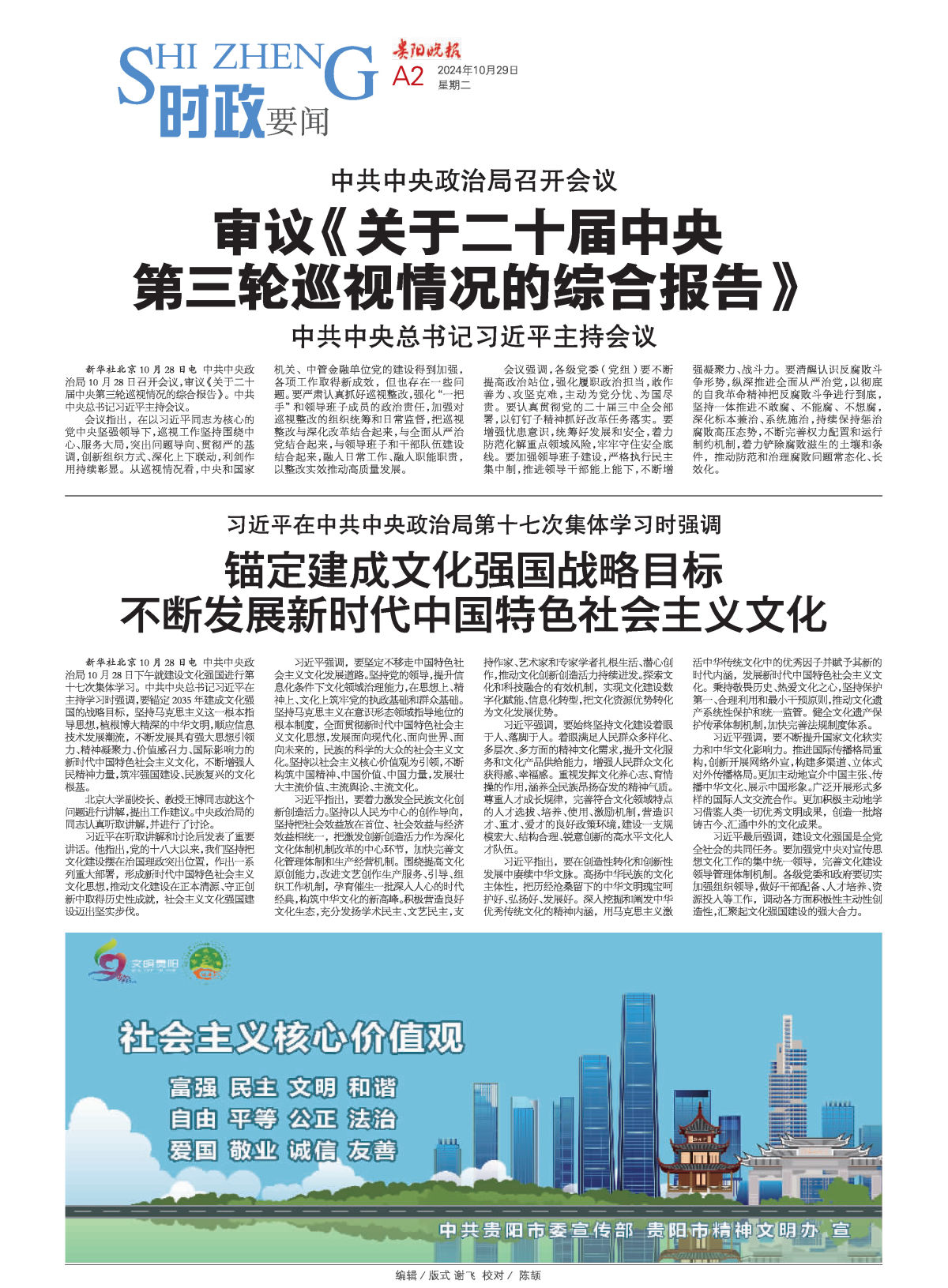 新华社北京10月28日电 中共中央政治局10月28日召开会议,审议《关于二十届中央第三轮巡视情况的综合报告》。中共中央总书记习近平主持会议。 会议指出,在以习近平同志为核心的党中央坚强领