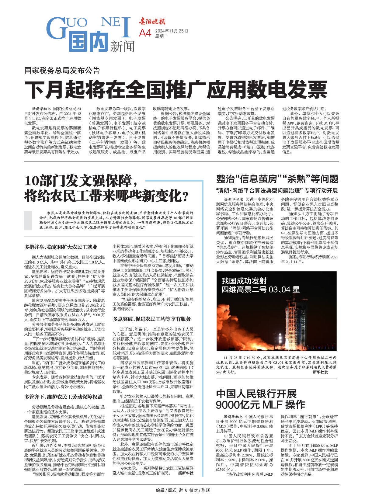 据新华社电 国家税务总局24日对外发布公告称,自2024年12月1日起,在全国正式推广应用数电发票。 数电发票是将发票的票面要素全面数字化、号码全国统一赋予、开票额度智能授予、信息通过税务数