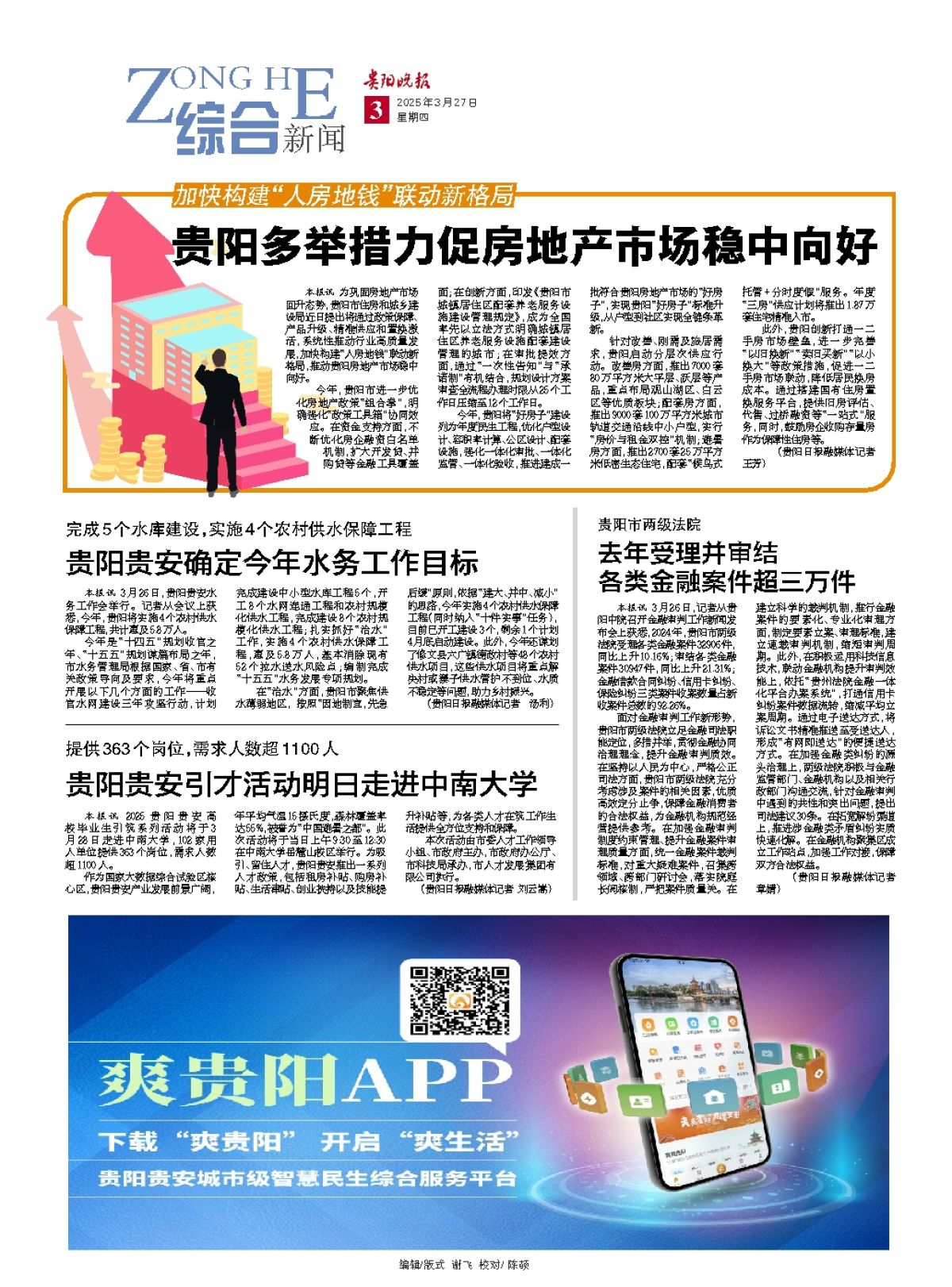 本报讯 3月26日,贵阳贵安水务工作会举行。记者从会议上获悉,今年,贵阳将实施4个农村供水保障工程,共计惠及5.8万人。 今年是“十四五”规划收官之年、“十五五”规划谋篇布局之年,市水务