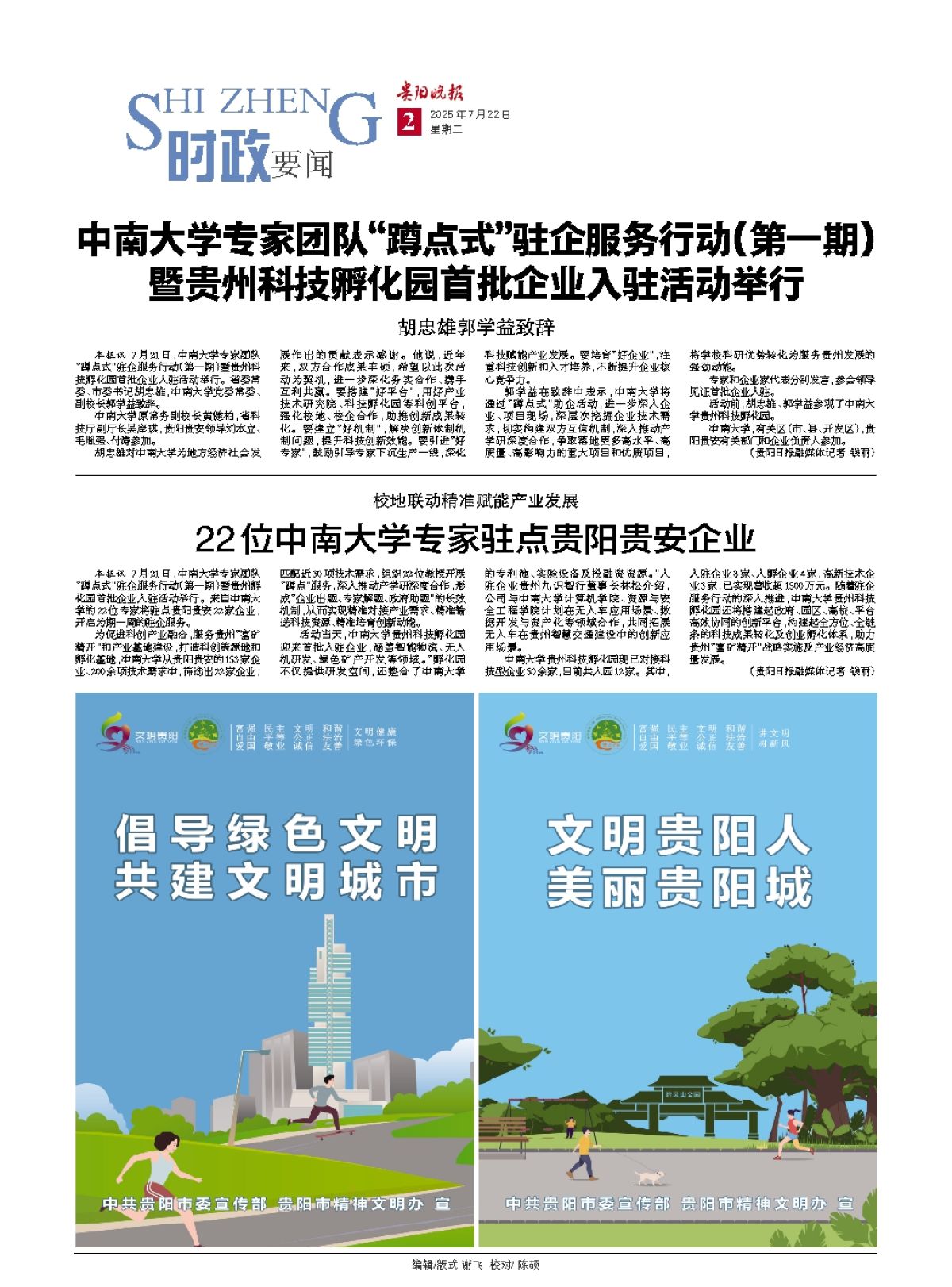 本报讯 7月21日,中南大学专家团队“蹲点式”驻企服务行动(第一期)暨贵州孵化园首批企业入驻活动举行。来自中南大学的22位专家将驻点贵阳贵安22家企业,开启为期一周的驻企服务。 为促进科