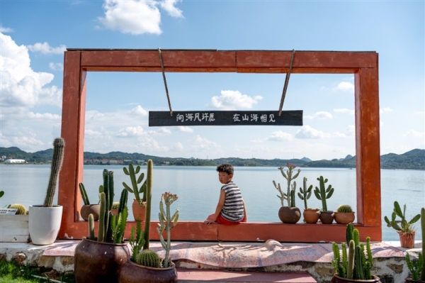 走进清镇市红枫湖镇右二村的蒙安·夕舍咖啡馆,扑面而来的是一幅贵州高原版的宫崎骏漫画世界,远处连绵不绝的群山倒映在眼前的湖水中,红黄蓝三原色模块装扮的民居群沿湖静静伫立,群鸟掠过的刹那,少女在村口奔跑着拍照。