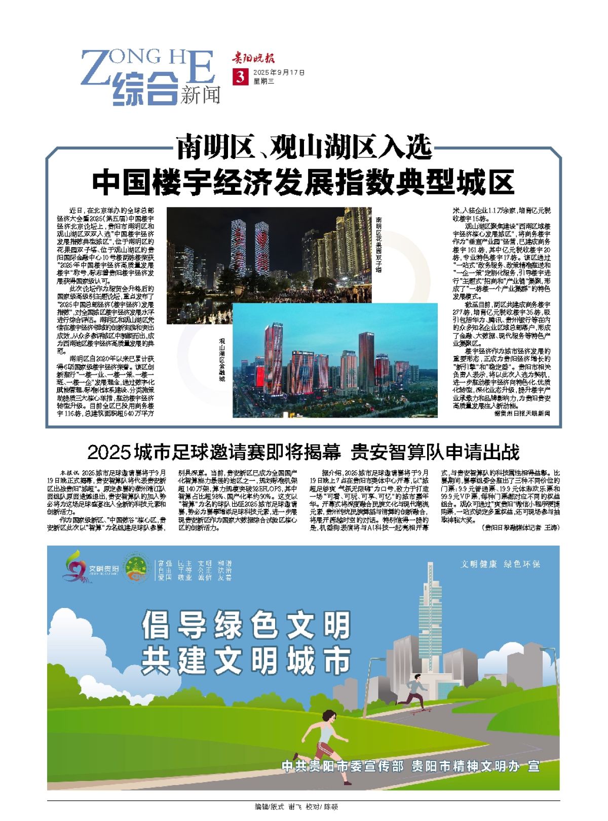 近日,在北京举办的全球总部经济大会暨2025(第五届)中国楼宇经济北京论坛上,贵阳市南明区和观山湖区双双入选“中国楼宇经济发展指数典型城区”,位于南明区的花果园双子塔、位于观山湖区的贵阳国际金