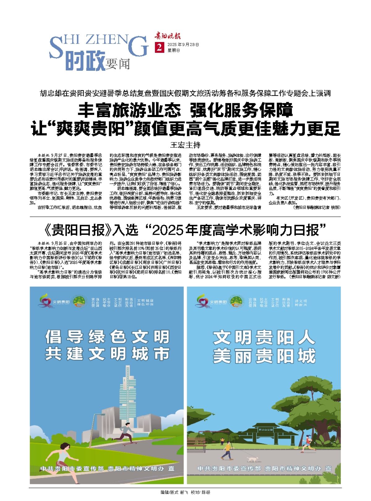本报讯 9月25日,由中国知网举办的“报纸学术影响力创新与发展论坛”在山西太原开幕,论坛期间发布2025年度《高学术影响力中国报纸评价报告》(以下简称《报告》),《贵阳日报》入选“2025年度