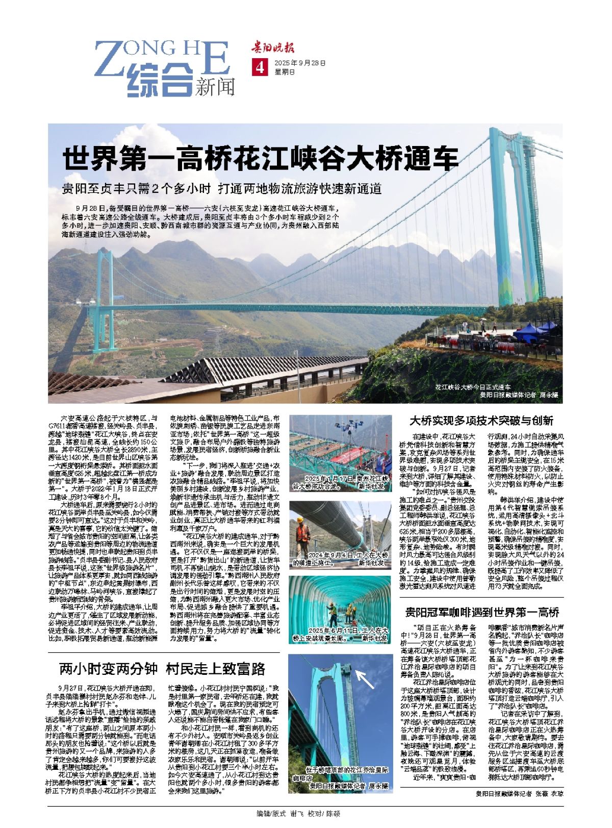 9月28日,备受瞩目的世界第一高桥——六安(六枝至安龙)高速花江峡谷大桥通车,标志着六安高速公路全线通车。大桥建成后,贵阳至贞丰将由3个多小时车程减少到2个多小时,进一步加速贵阳、安顺、黔西南