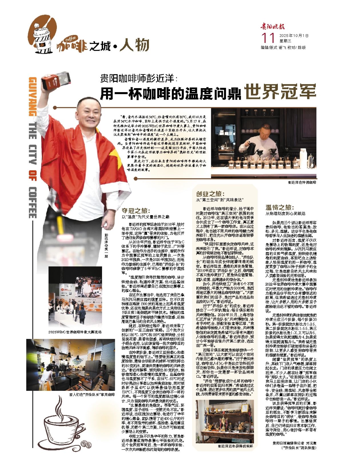 彭近洋夺奖一刻 2025WBrC世界咖啡冲煮大赛现场 客人们在“乔治队长”享用咖啡 彭近洋在冲调咖啡 彭近