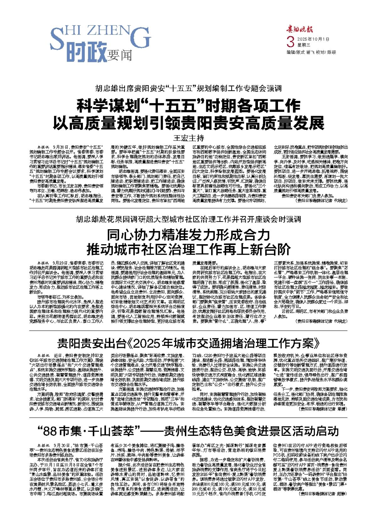 本报讯 9月30日,贵阳贵安“十五五”规划编制工作专题会召开。省委常委、市委书记胡忠雄出席并讲话。他强调,要深入学习贯彻习近平总书记对“十五五”规划编制工作的重要讲话重要指示精神,落实省委“