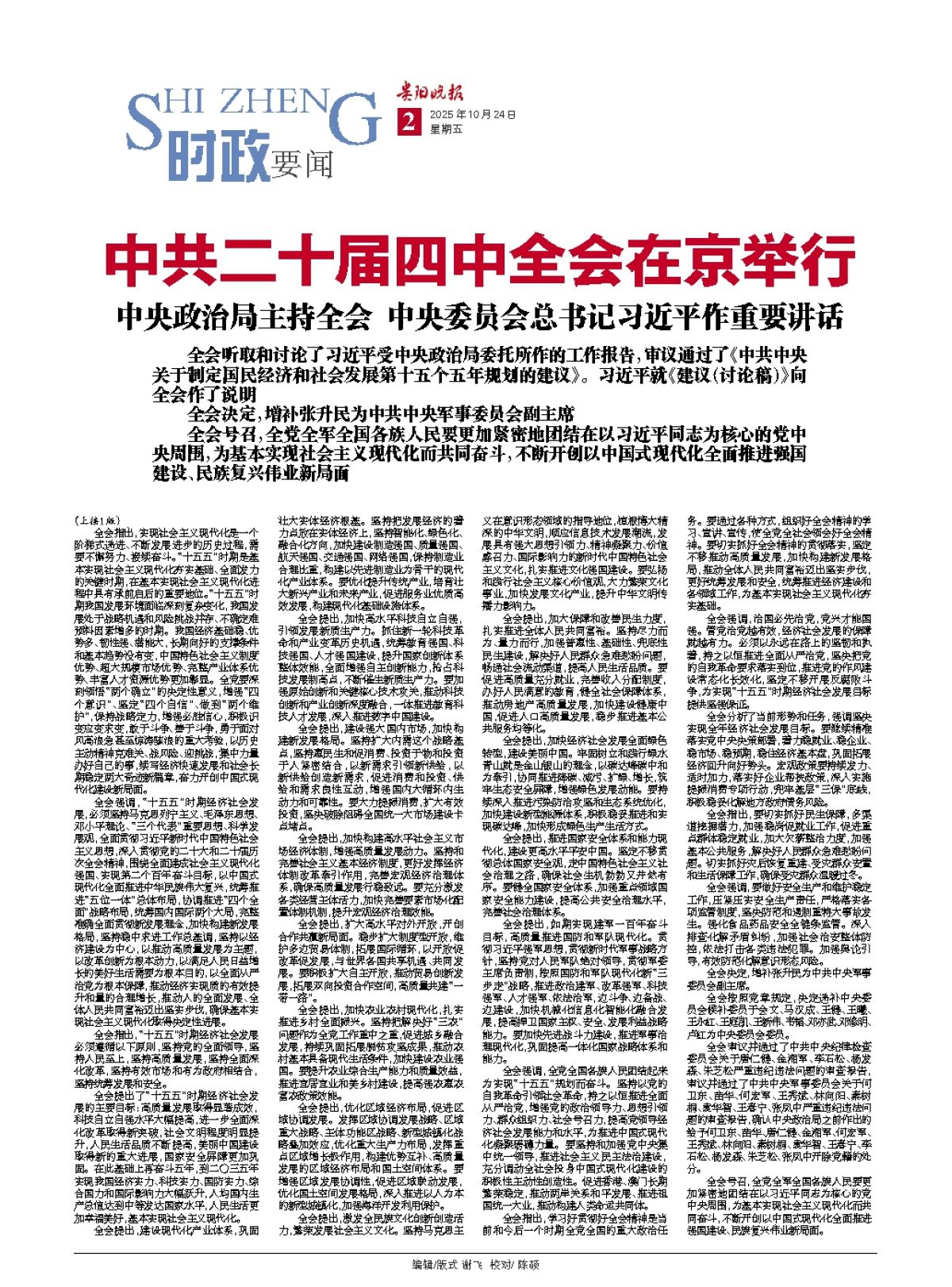 中国共产党第二十届中央委员会第四次全体会议,于2025年10月20日至23日在北京举行。