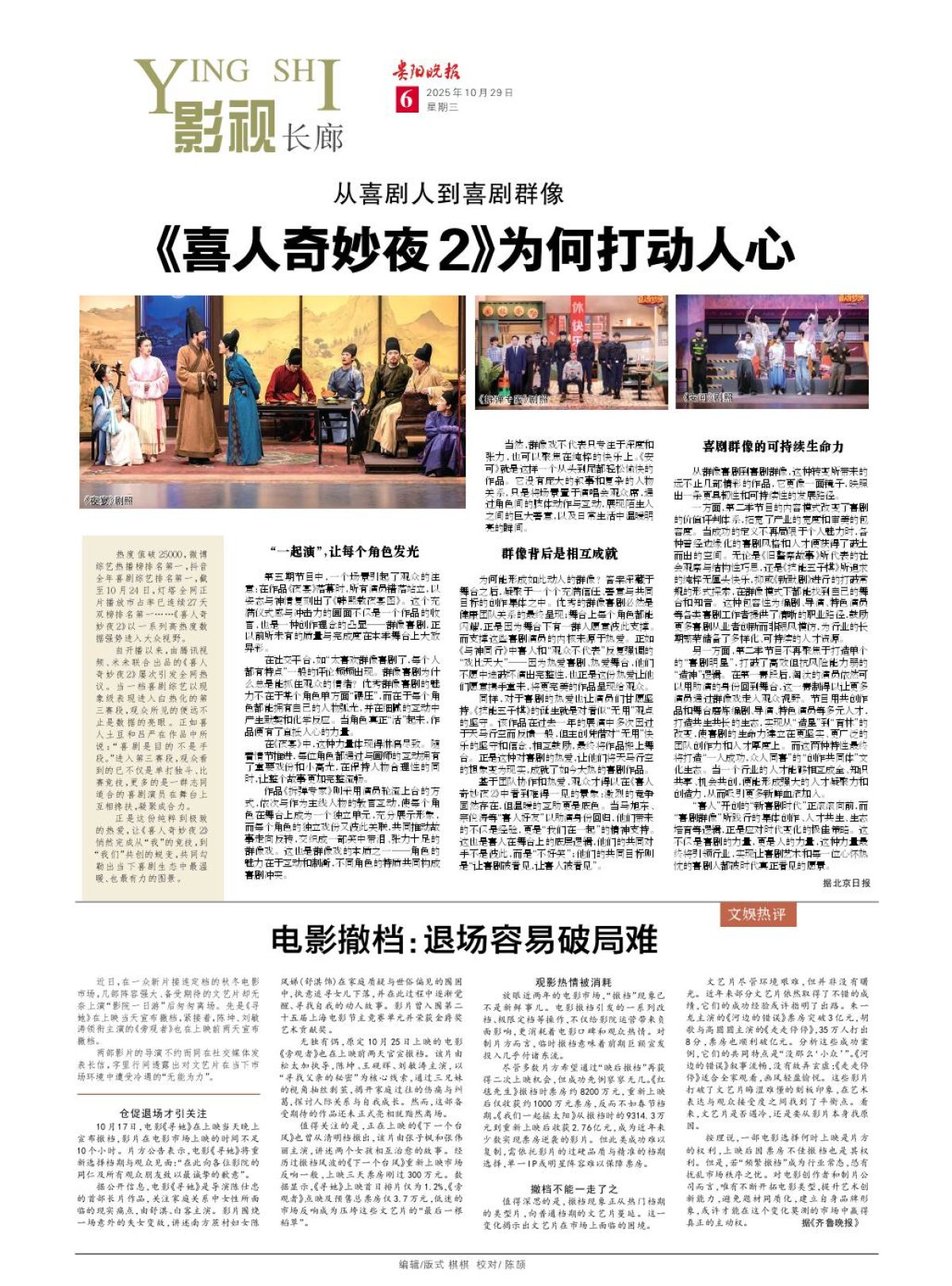 “喜人”开创的“新喜剧时代”正滚滚向前,而“喜剧群像”所践行的集体创作、人才共生、生态培育等逻辑,正是应对时代变化的极佳策略。这不仅是喜剧的力量,更是人的力量,这种力量最终将引领行业,实现让喜剧艺术和每一位心怀热忱的喜剧人都被时代真正看见的愿景。 据北京日报