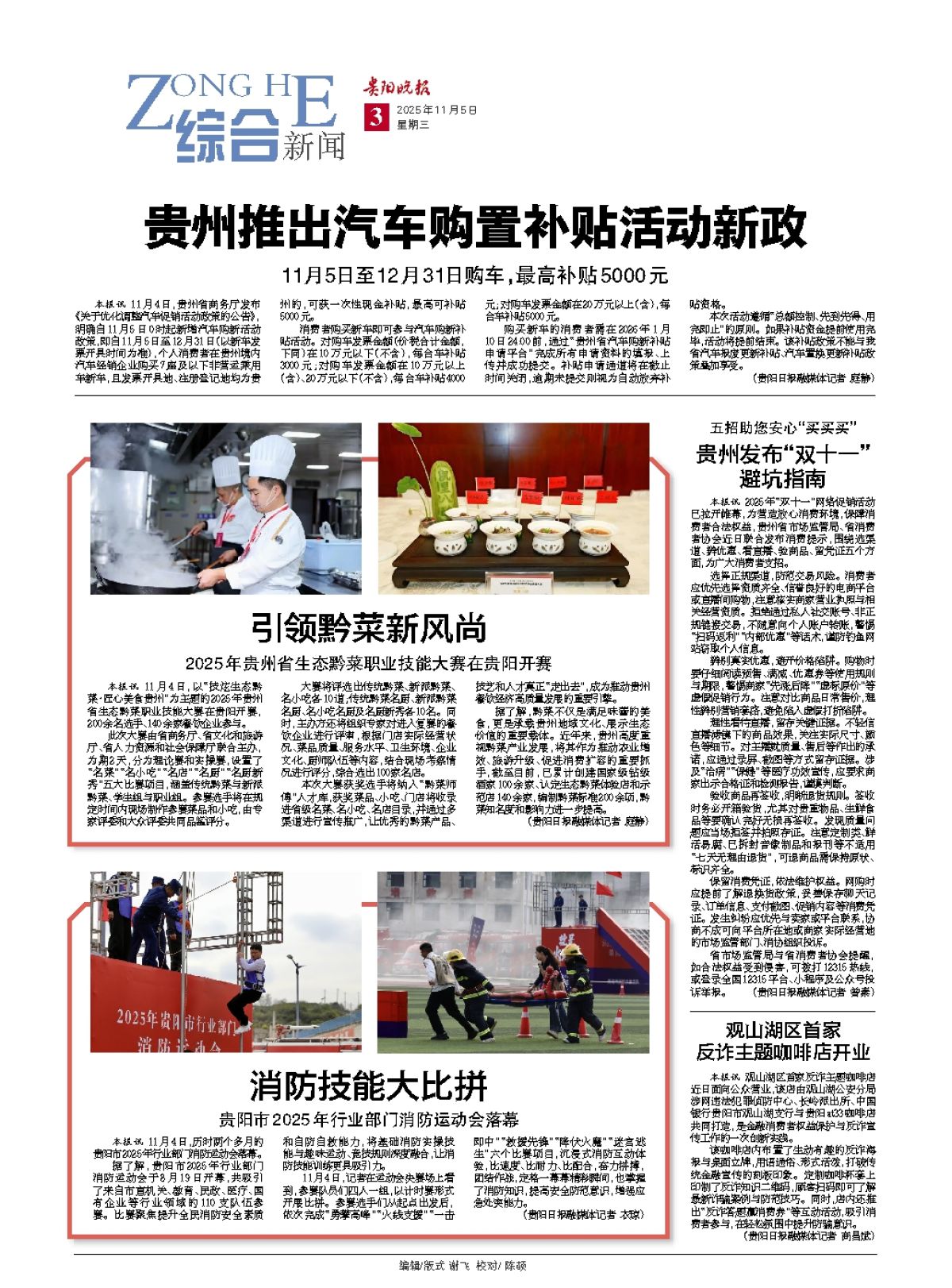 本报讯 11月4日,贵州省商务厅发布《关于优化调整汽车促销活动政策的公告》,明确自11月5日0时起新增汽车购新活动政策,即自11月5日至12月31日(以新车发票开具时间为准),个人消费者在贵州境内汽车经销企业购买7座及以下非营运乘用车新车,且发票开具地、注册登记地均为贵州的,可获一次性现金补贴,最高可补贴5000元。