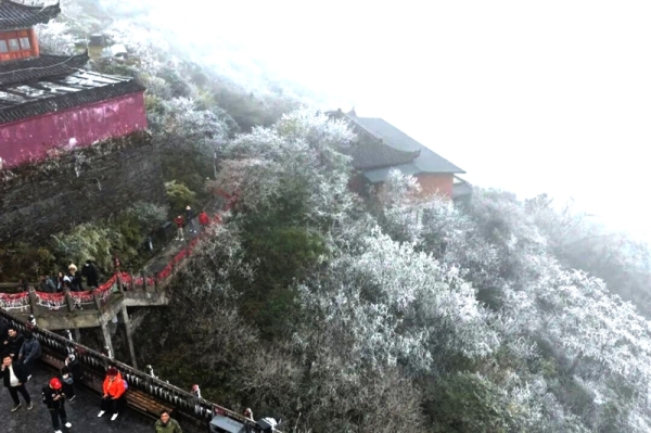 另据铜仁市广播电视台消息,11月18日,世界自然遗产地梵净山迎来今冬首场降雪,雾凇点缀银装素裹,美不胜收。