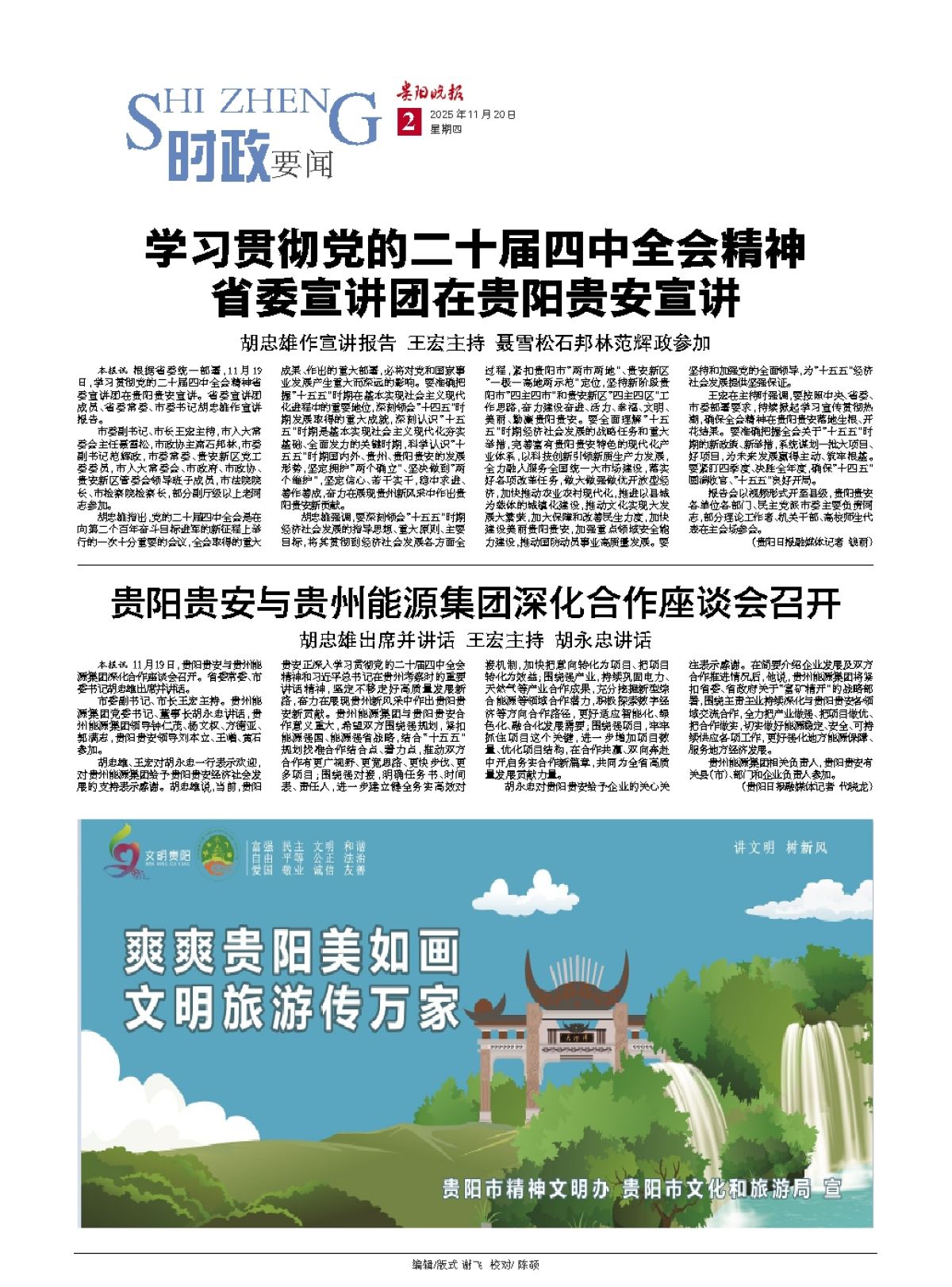 本报讯 根据省委统一部署,11月19日,学习贯彻党的二十届四中全会精神省委宣讲团在贵阳贵安宣讲。省委宣讲团成员、省委常委、市委书记胡忠雄作宣讲报告。 市委副书记、市长王宏主持,市人大常委