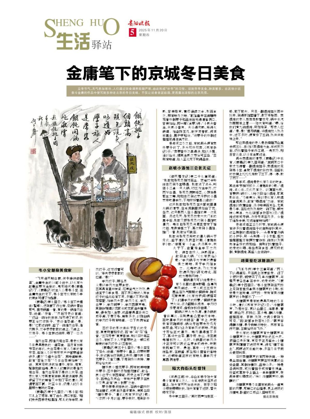 立冬节气,天气愈加寒冷,人们通过饮食调养抵御严寒,由此形成“补冬”的习俗。说到冬季美食,种类繁多。在武侠小说泰斗金庸的作品中便写到多种老北京的冬日美味。不仅让读者垂涎欲滴,更透露出浓郁的北京风