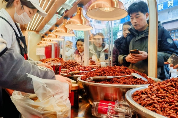 12月14日,民生路上的不少美食店铺前都排着长队,站满选购贵阳美食的游客。时下虽是旅游淡季的冬天,但随着高铁等交通的便捷,周末短程跨省市旅游却在贵阳火热起来。