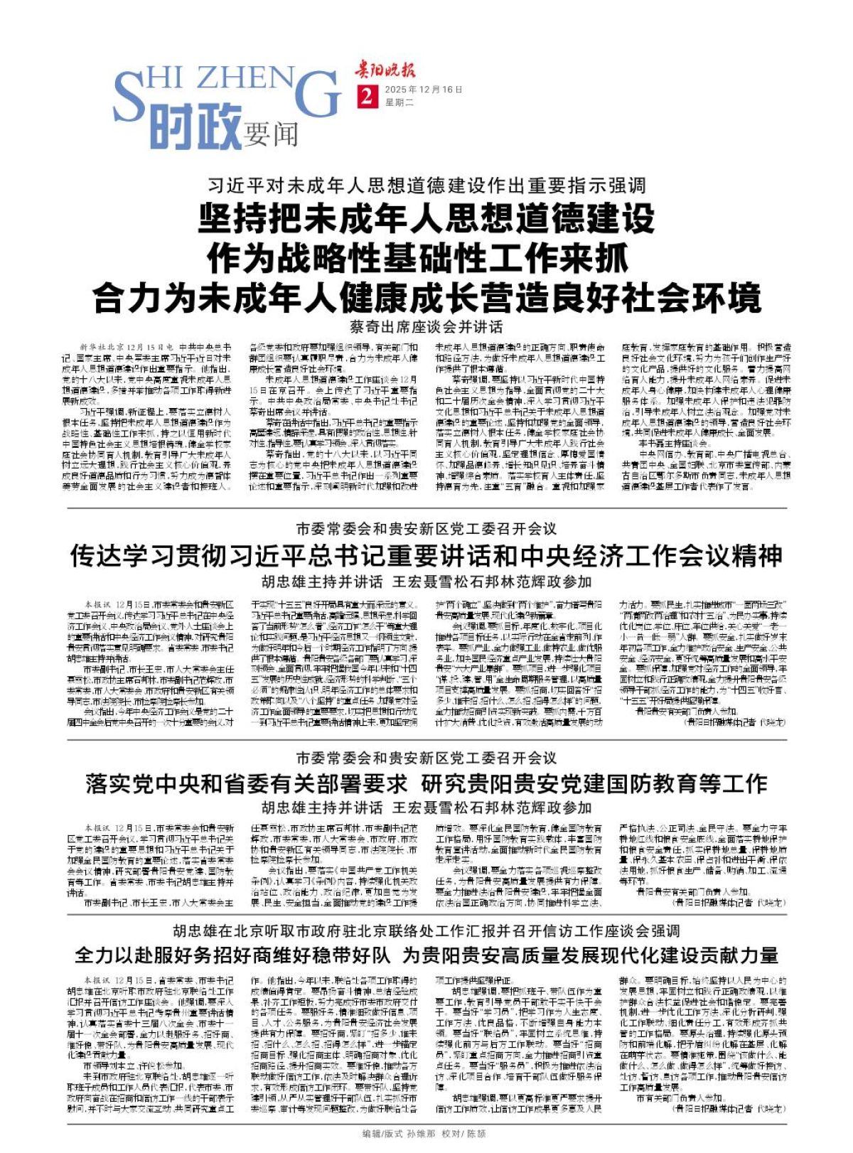 本报讯 12月15日,市委常委会和贵安新区党工委召开会议,学习贯彻习近平总书记关于党的建设的重要思想和习近平总书记关于加强全民国防教育的重要论述,落实省委常委会会议精神,研究部署贵阳贵安党建、