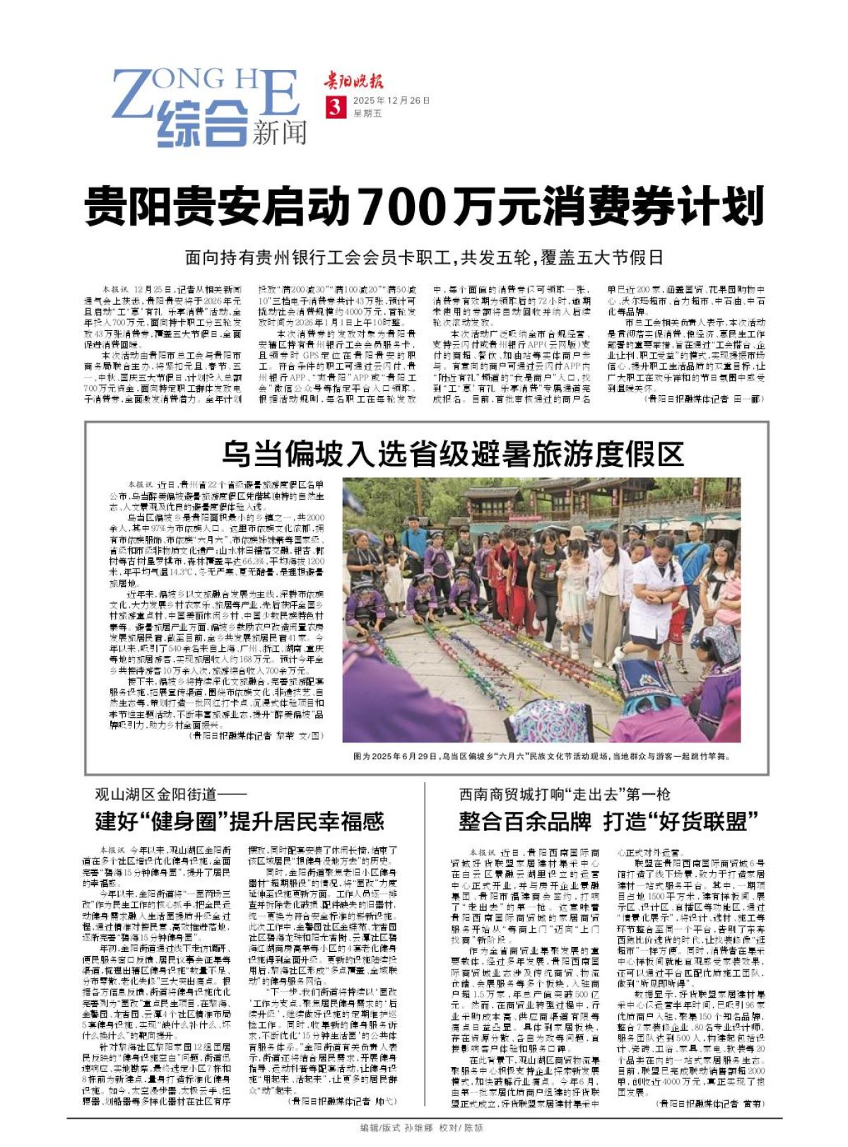本报讯 12月25日,记者从相关新闻通气会上获悉,贵阳贵安将于2026年元旦启动“工‘惠’有礼 乐享消费”活动,全年投入700万元,面向持卡职工分五轮发放43万张消费券,覆盖五大节假日,全面促