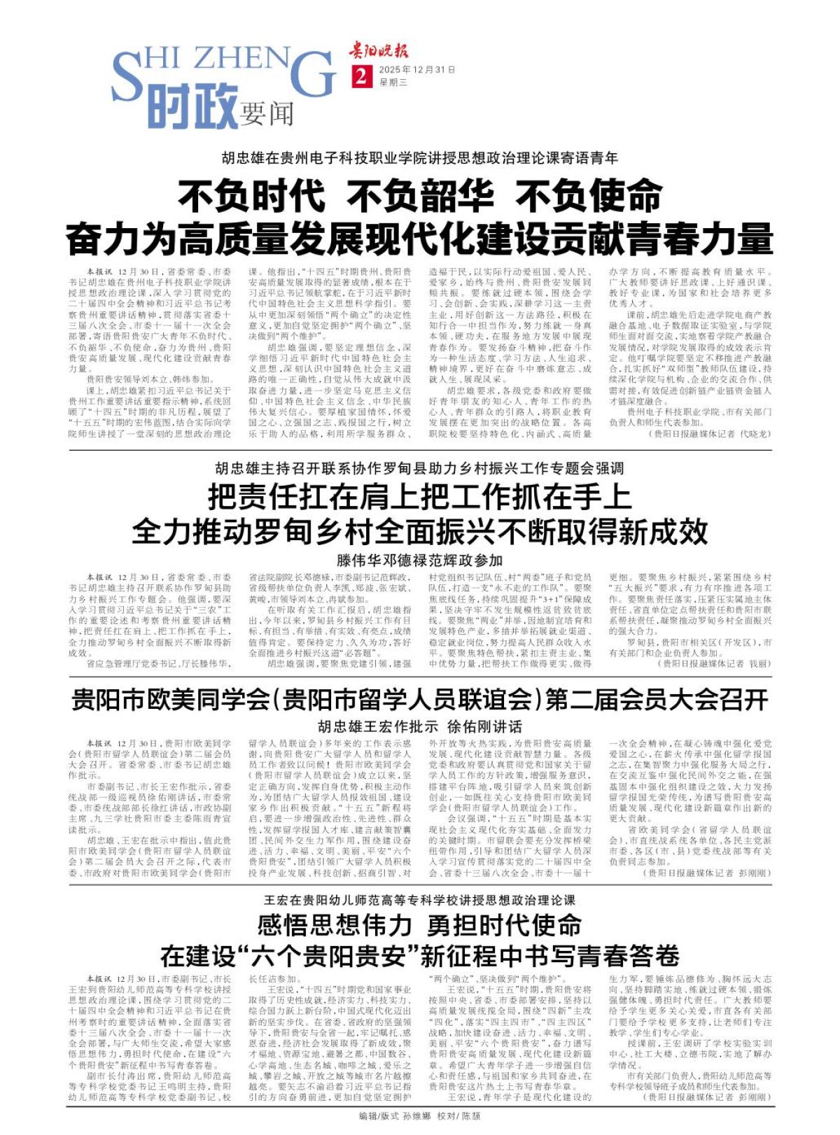本报讯 12月30日,省委常委、市委书记胡忠雄在贵州电子科技职业学院讲授思想政治理论课,深入学习贯彻党的二十届四中全会精神和习近平总书记考察贵州重要讲话精神,贯彻落实省委十三届八次全会、市委十