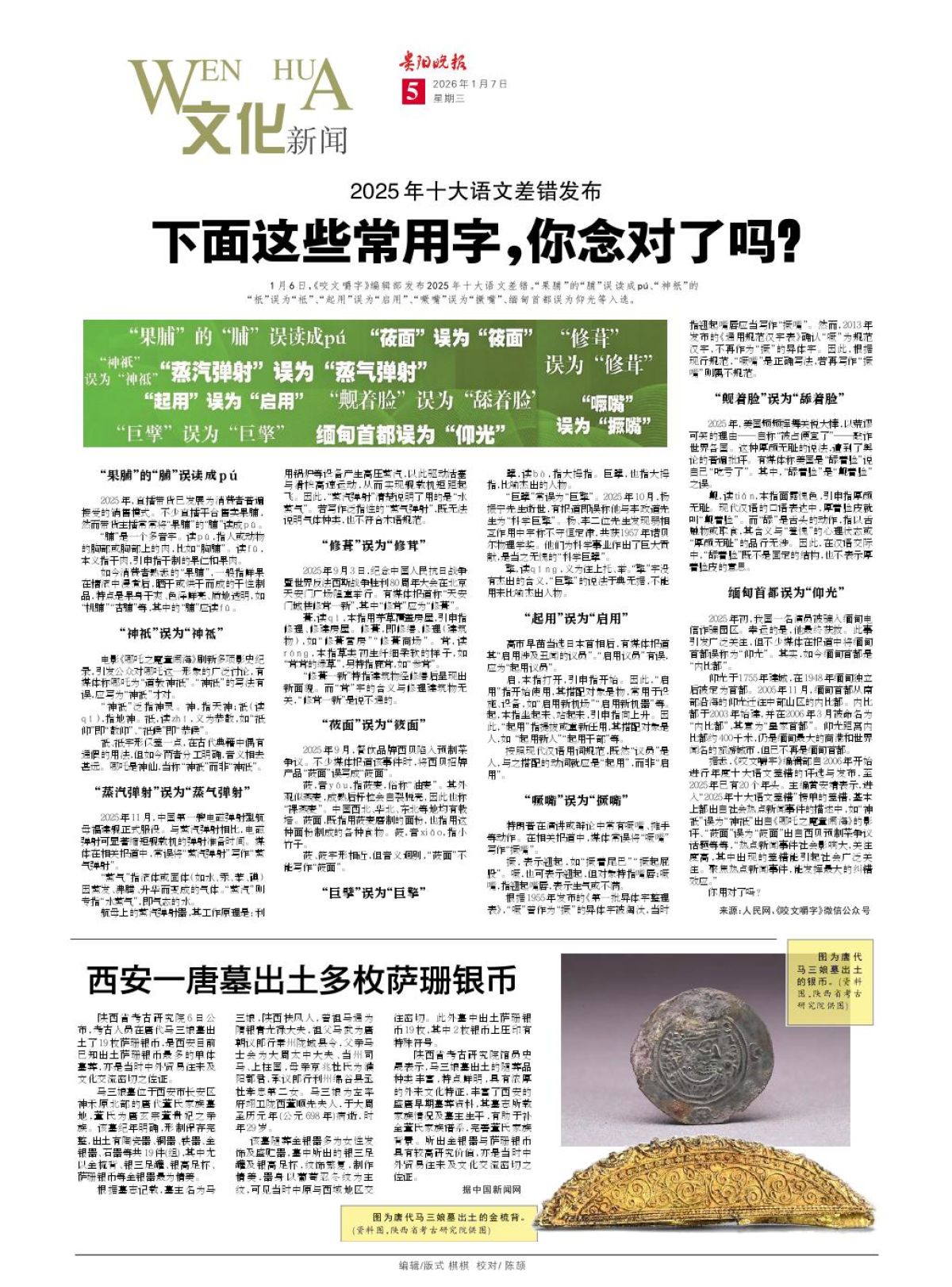 1月6日,《咬文嚼字》编辑部发布2025年十大语文差错。“果脯”的“脯”误读成pú、“神祇”的“祇”误为“祗”、“起用”误为“启用”、“噘嘴”误为“撅嘴”、缅甸首都误为仰光等入选。