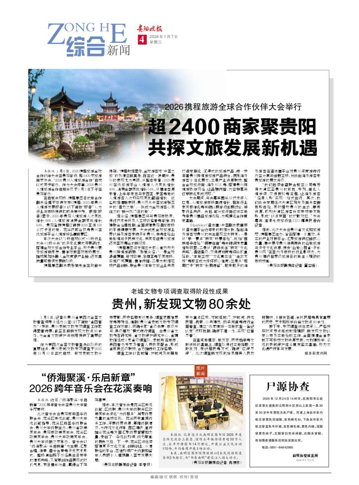 本报讯 1月6日,2026携程旅游全球合作伙伴大会在贵阳举行,超2400家旅游商家参会。“2026贵州入境旅游合作”启动仪式同步举办。作为大会序章,2026贵州入境旅游合作启航会已于1月5日下