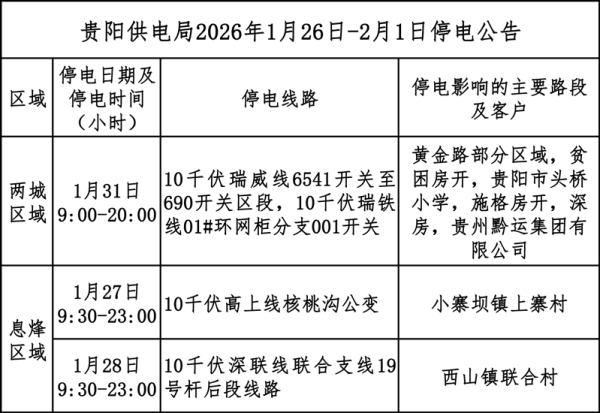为了提高电网供电质量,贵阳市2026年1月26日-2月1日将对以下线路进行计划检修停电,请广大客户做好停电准备,对此给您造成的不便,我们表示深深的歉意。
