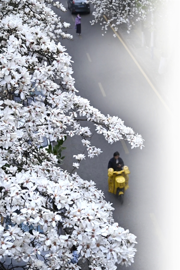 洁白玉兰宛如白衣仙子悄然伫立,与街头巷尾尚未散尽的新春烟火气相映成趣,构成了一幅绝美的城市画卷。