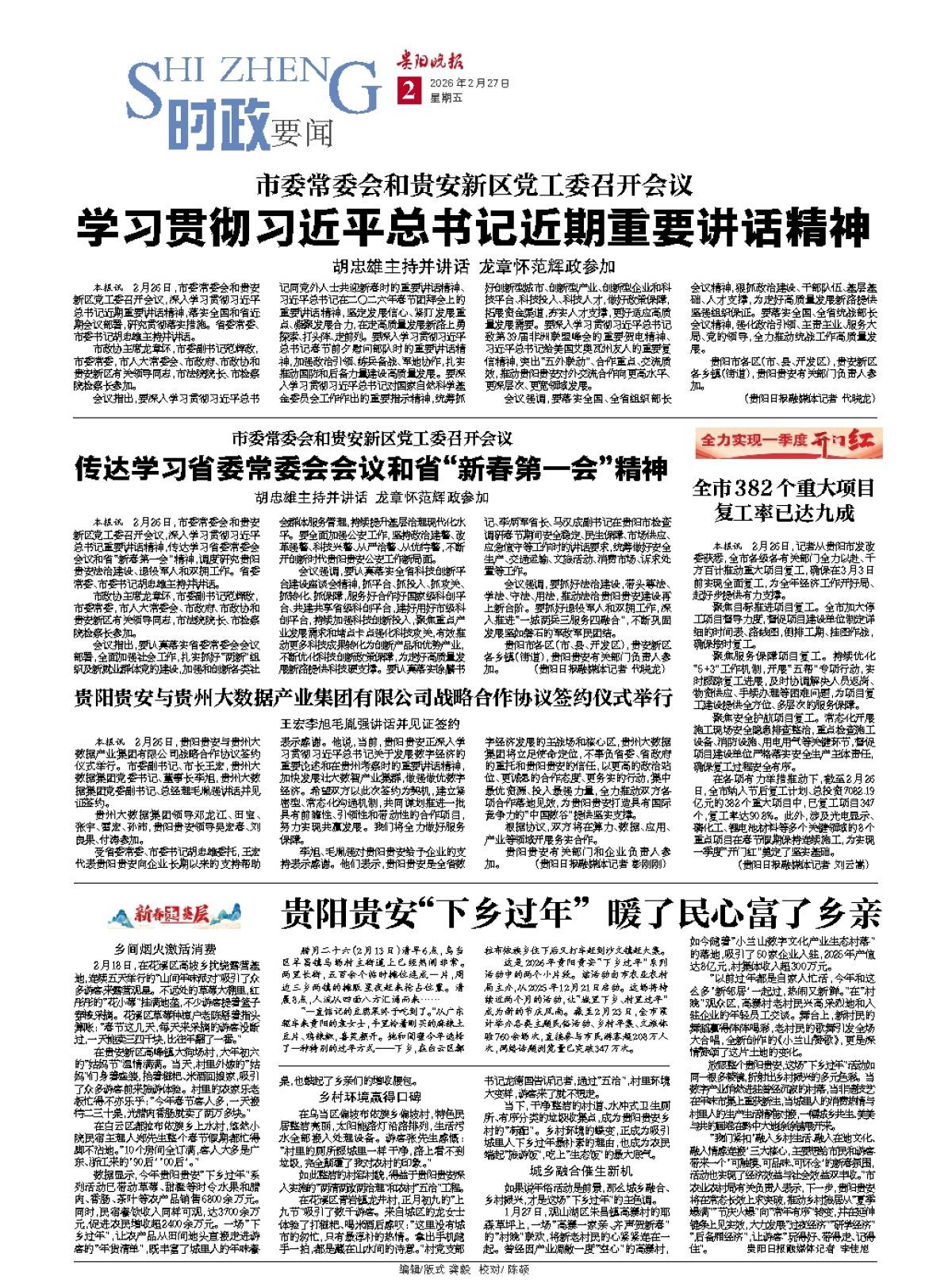 本报讯 2月26日,市委常委会和贵安新区党工委召开会议,深入学习贯彻习近平总书记近期重要讲话精神,落实全国和省近期会议部署,研究贯彻落实措施。省委常委、市委书记胡忠雄主持并讲话。 市政