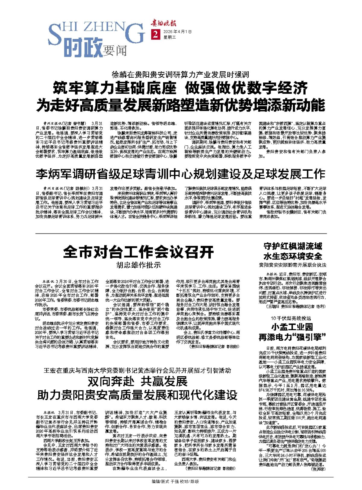 本报讯 3月31日,市委副书记、市长王宏在重庆市与西南大学党委副书记黄杰举行会见并主持召开黔籍毕业生代表座谈会,出席贵阳贵安2026年高校毕业生引筑系列活动西南大学专场招聘活动。 西南