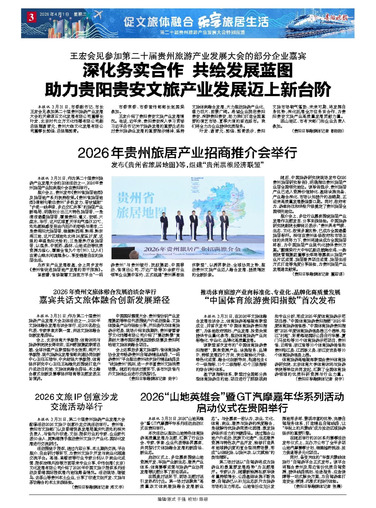 本报讯 3月31日,作为第二十届贵州旅游产业发展大会主体活动之一,2026年文旅体融合发展洽谈会举行,近200名政企代表、专家学者齐聚一堂,共话文旅体融合创新发展路径。 会上,北京体育大