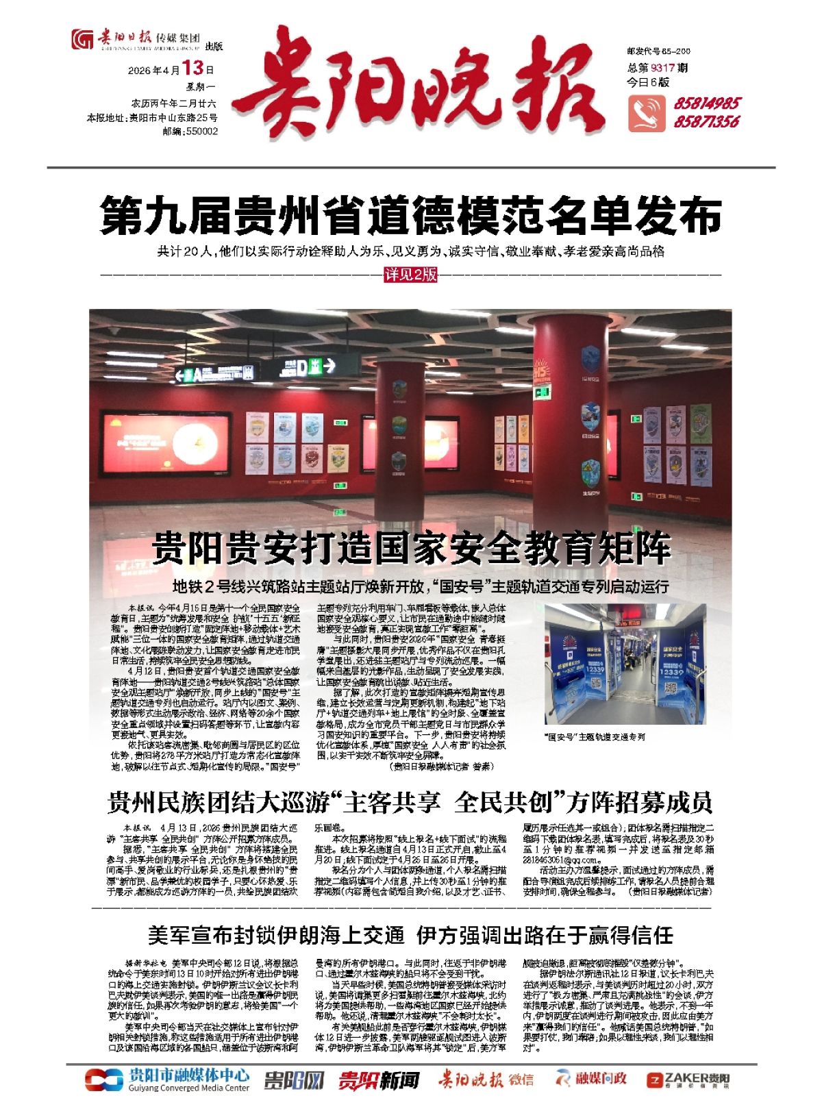 本报讯 今年4月15日是第十一个全民国家安全教育日,主题为“统筹发展和安全 护航‘十五五’新征程”。贵阳贵安创新打造“固定阵地+移动载体+艺术赋能”三位一体的国家安全教育矩阵,通过轨道交通阵地