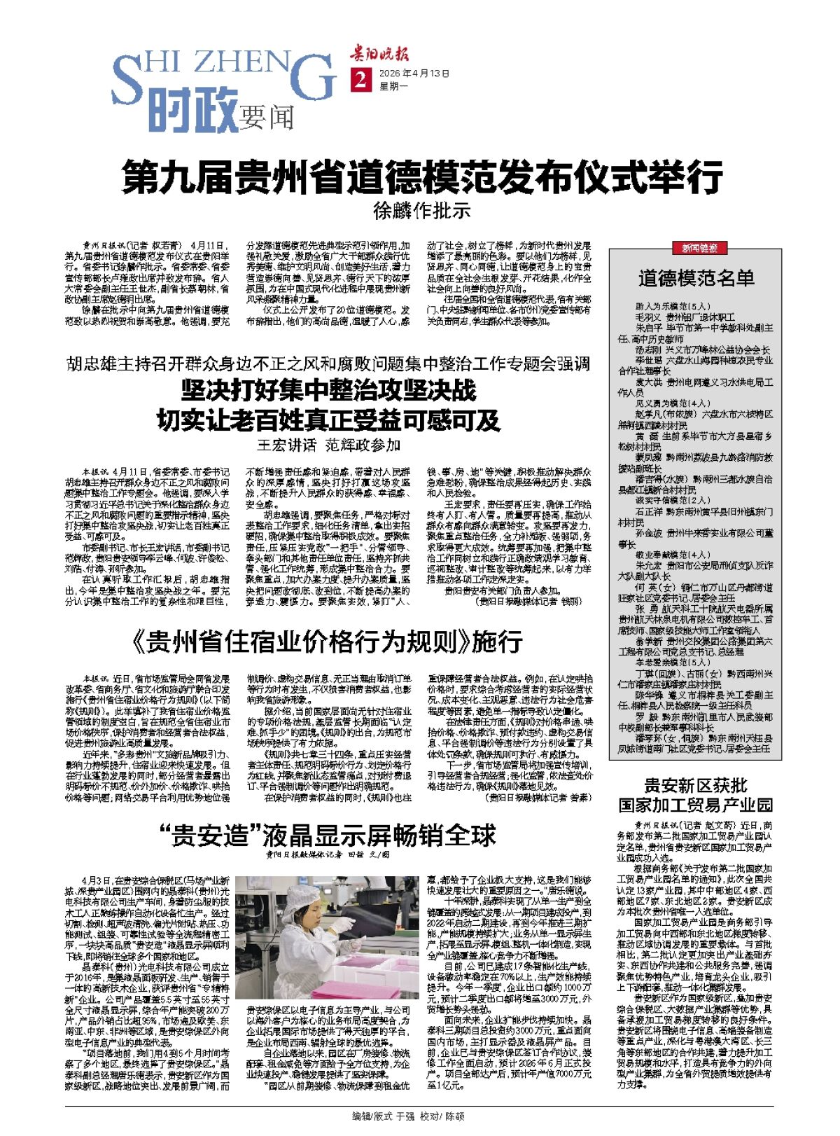 贵州日报讯(记者 权若青) 4月11日,第九届贵州省道德模范发布仪式在贵阳举行。省委书记徐麟作批示。省委常委、省委宣传部部长卢雍政出席并致发布辞。省人大常委会副主任王世杰,副省长蔡朝林,省政