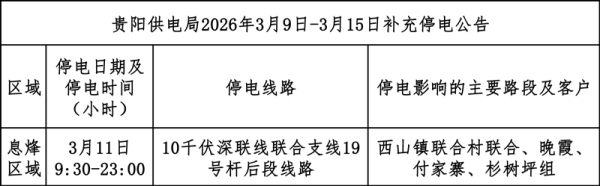 为了提高电网供电质量,贵阳市2026年3月9日-3月15日将对以下线路进行计划检修停电,请广大客户做好停电准备,对此给您造成的不便,我们表示深深的歉意。
